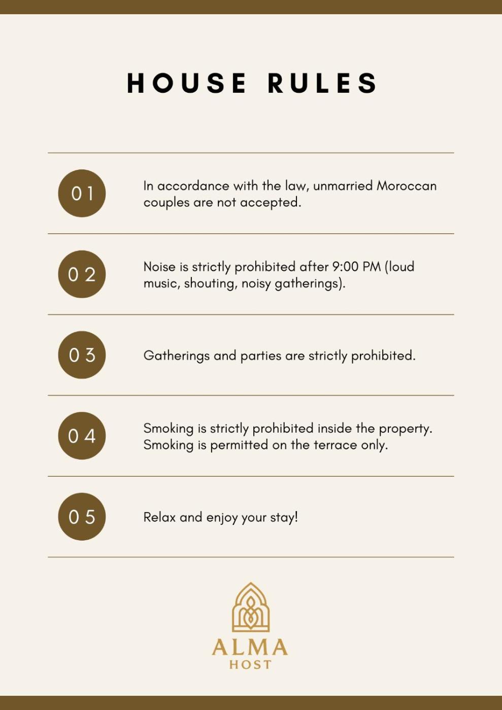 In accordance with current law, unmarried Moroccan couples are not accepted.This property will not accommodate hen, stag or similar parties.