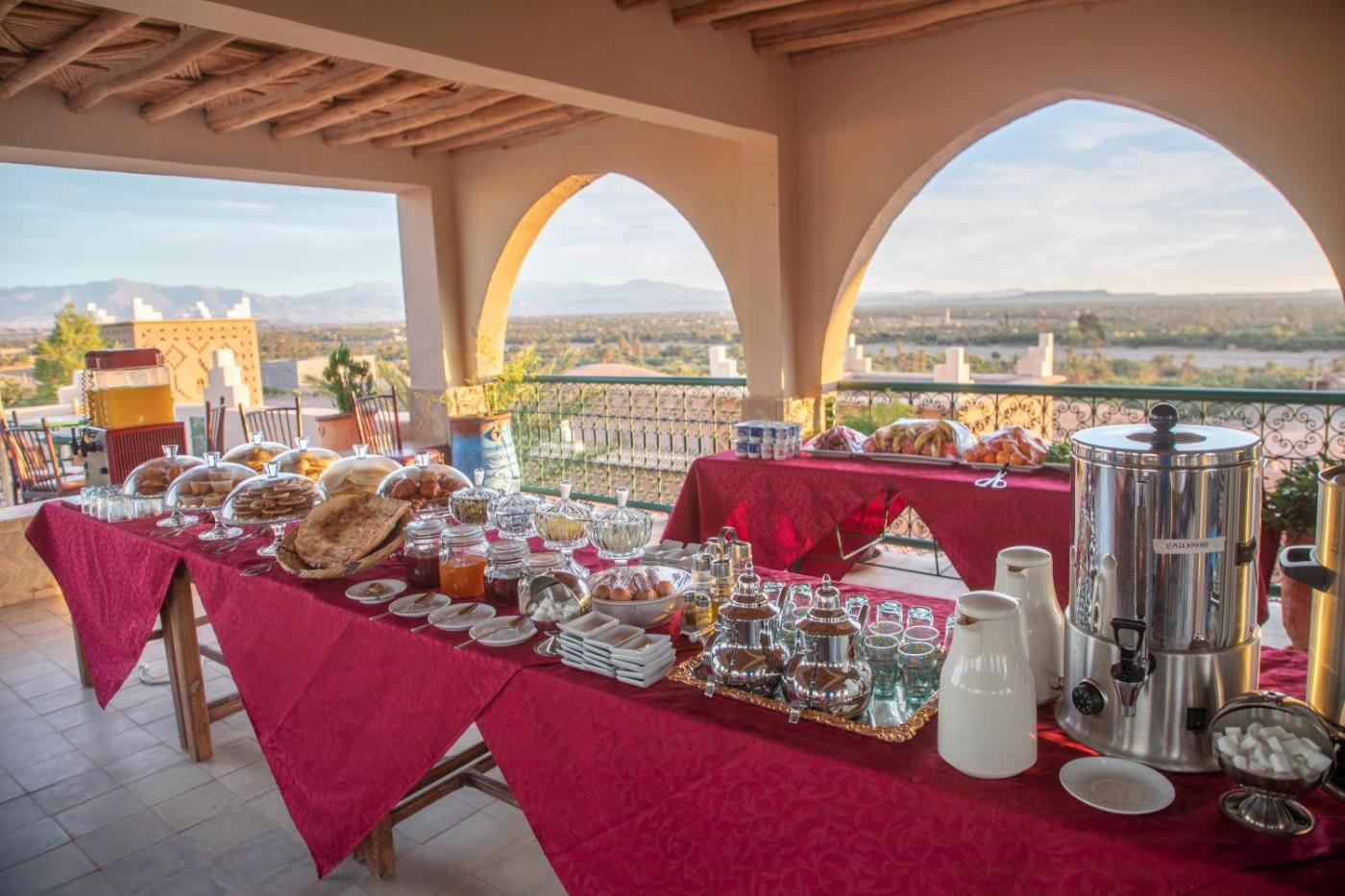 Traditional Moroccan dishes are served on the rooftop terrace, with views of the valley. Breakfast is prepared every morning at the Auberge Taloute Ecolodge.