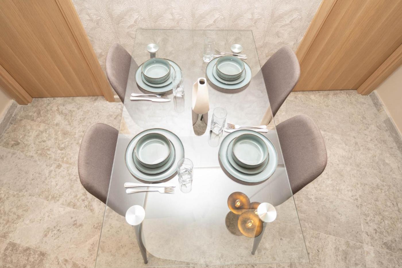 Two-Bedroom Apartment with City View. This spacious apartment is comprised of 1 living room, 2 separate bedrooms and 2 bathrooms with a shower and free toiletries. Guests can make meals in the kitchen that is fitted with a stovetop, a refrigerator, a dishwasher and kitchenware. The air-conditioned apartment offers a flat-screen TV, a washing machine, a tea and coffee maker, a dining area as well as a quiet street view. The unit offers 4 beds.